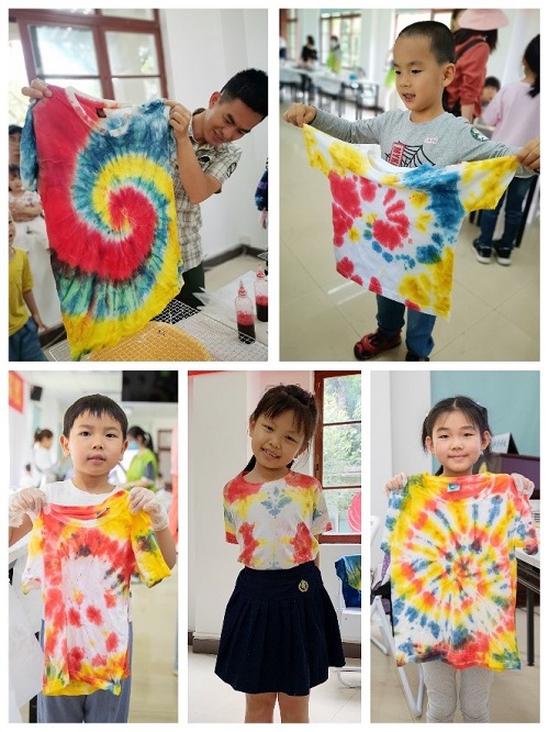 “纸上得来终觉浅,绝知此事要躬行”,初步了解了扎染的制作方法和流程后,就开始亲手体验了。人手一件纯棉白T恤,大家天马行空,恣意想象,借助各种工具,运用老师所讲知识,把T恤扭、捆、旋、折、绑成各种形状后再小心翼翼地上色,大人孩子都专注地创作着自己的作品。终于,见证奇迹的时候到了!当大家解开T恤上的各种捆扎,展开衣服时,课室里一阵一阵哇、哇的惊叹声。孩子们的作品色彩缤纷、鲜明活泼;成人的作品则清爽淡雅,如林中初雪,如雨后清风。每一件作品都不一样,每一件作品都有无限的想象和解读,这就是扎染的神奇又吸引人之处!