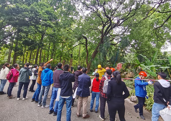 开幕式后,华南植物园树艺师团队联手澳门树艺师团队在园区做了精彩的树木修剪溜缆技术演示。参会成员近距离观赏了树艺师们利用绳索攀树系统自由上升、下降、转换、横渡、休息与工作,安全自由地穿梭在树林间的场景。
