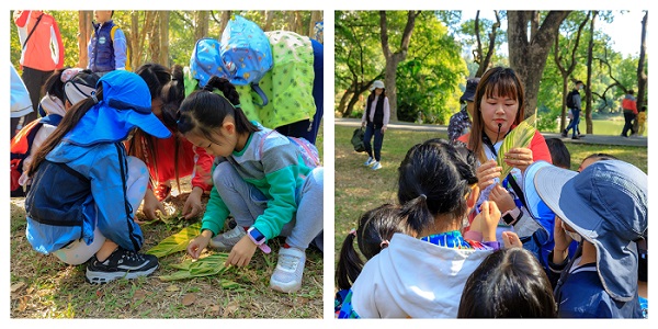 当孩子们身心开始融入自然的时候,便会感知其中竟有太多平日里被忽略的神奇,大自然中的一草一木只要与艺术的火花碰撞后都会产生奇妙的产物,只要我们用心感受,就会发现身边的每个角落,一点一滴都是自然的杰作。本环节通过寻找一片叶子失散的两部分,让孩子们在游戏中体会自然界的原创之美。