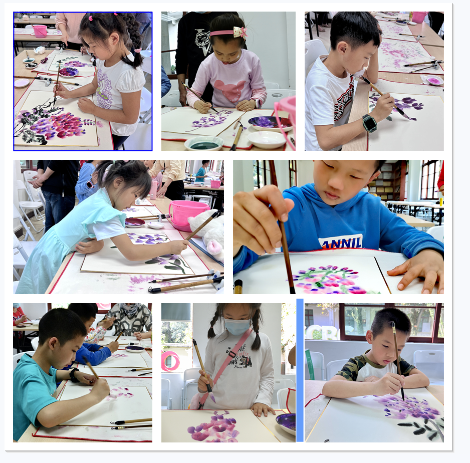 国画讲究毛笔运用的方法,即:因毛笔而产生的“用笔”和“用墨”。通过用墨用水的分量轻重,一笔就能画出一片紫藤花瓣或是花蕊;然后再运用笔锋行走就可以勾勒出叶脉和藤枝。老师耐心地给孩子们讲解国画的基本知识,从纸张的特点、毛笔的类型再到砚台的考究、如何构图和着墨等等,都一一地细数道来。紧接着,孩子们围绕到老师身边,近距离观摩紫藤是如何画成的。