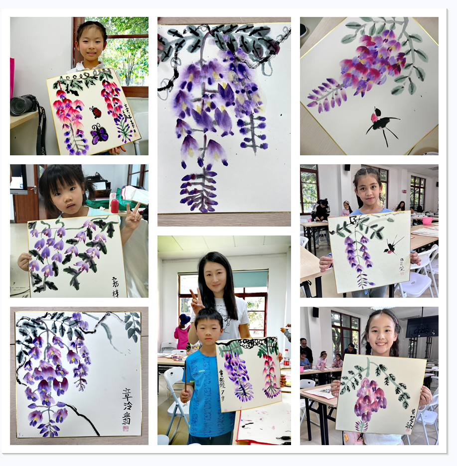 美好的事物,热爱画画的孩童总是想要亲手把它画下来的。孩子们在老师指导下,现场将紫藤花轮廓简单记录下来,接下来回到课室,在笔墨的挥洒之间,以国画的形式表现紫藤的美。
