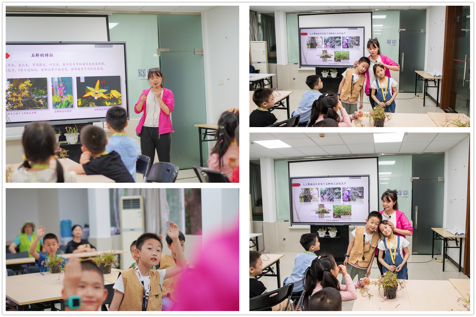 也许是路途上的好奇与欢乐,到达营地的孩子们格外开心,孩子们开始进入今天的主题,学习了解药食同源之中草药。课堂上,科普老师从石斛的来历,生长特点等一一与孩子们介绍。野生石斛因为过度开采及自然繁殖困难,人工繁殖技术实现了石斛的工业化生产。华南国家植物园的现代育种技术促进了高质石斛新品种的选育,铁皮石斛育种成果的“中科双春1号”与“中科五号”抗病虫能力强,可最大限度降低铁皮石斛产品农药残留。每个知识点与孩子们的互动特别有趣,每次的提问孩子们争先回答,答案正确时还可以自由选择自己喜欢的小礼物。