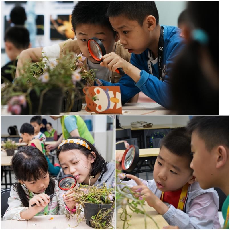 知识点传授完毕,孩子们需要观察桌面上的石斛还有什么特点?孩子们的观察能力真的好棒,他们用放大镜观察着找出了不同的特点:花朵向下,花瓣里长有毛毛;茎有好多节,茎上长有根;花瓣里有一处的颜色更深更鲜艳一些,这个鲜艳的颜色能让昆虫更精准地找到花粉。于是孩子们化身成为小蜜蜂,给植物完成授粉的生长过程。他们拿着小聂子取出一朵花的花粉,与邻旁的小朋友更换,再用小聂子把换回来的花粉放到原来的花朵里。