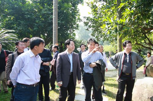 11月24日,广西梧州市代表团在市委副书记刘有明率领下访问华南植物园。考察团由梧州市委副秘书长林树锋、市农业局局长覃柱材、市农科所所长邱卫华、梧州神龙药业有限公司董事长陈军等14人组成,华南植物园副主任魏平、园主任助理夏汉平及魏孝义、谢海辉研究员等接待了考察团一行并陪同参观。 座谈会上,魏平首先代表园领导班子对考察团的到来表示热烈欢迎。他向刘有明等详细介绍了植物园的历史与现状、主要研究领域和代表成果、院地共建与国际合作、科学普及和旅游开放、以及人才引进和培养等情况,重点就地方经济发展需求的院地科技转换和产业化合作方面,如药用植物的研发、水果保鲜、花卉栽培与产业化、农作物新品选育等,与梧州市考察团进行了深入交流和探讨,并达成初步合作意向。 随后,刘有明一行考察了大型景观温室群、苏铁园、兰园和药用植物园等功能园区和景点。考察团仔细倾听了情况介绍,并不时询问园林景观设计、科研进展及植物新技术的产业开发等情况。刘有明指出,华南植物园为广东省的科技发展、地方经济建设、科普教育和社会进步作出了很大贡献,这次到植物园调研,看到植物园的飞跃发展深受鼓舞,并希望能将这些优秀的科研成果和经验带到梧州市去。魏平表示,希望今后双方加强园林景观设计、药物研发、药材种苗的繁育与规范化种植、花卉和水果新品种栽培等方面的科技合作,为地方的科技与经济发展作出积极贡献。