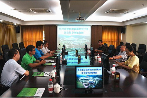 6月8日,台湾青商会常务副会长黄健信等一行在广州市人民政府台湾事务办公室领导同下访问华南植物园,并就有关项目的合作进行座谈。华南植物园合作交流处副处长王克亚、园艺中心执行主任蒋厚泉、副主任熊秉红等接待客人。