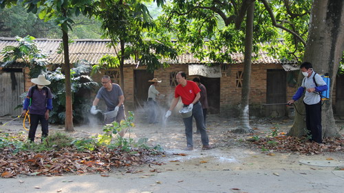 华南植物园工作人员对宿舍区进行消毒作业