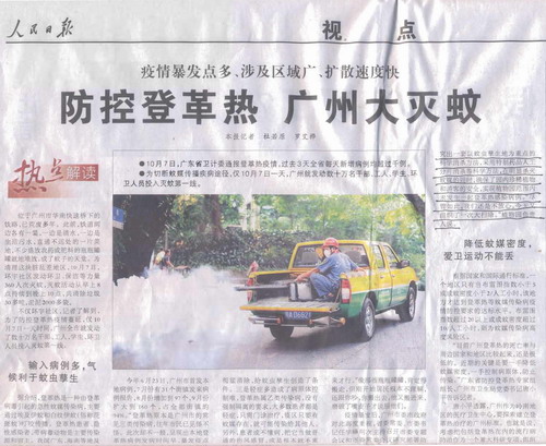 10月8日《人民日报》视点栏目以题为《防控登革热 广州大灭蚊》专题报道了广州地区登革热防疫工作的第一线战况,重点介绍了中科院华南植物园在防控疫情中的先进经验,文中对植物园的防控举措给予了高度评价。