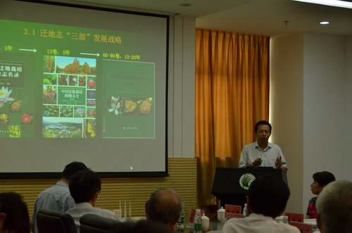项目负责人廖景平研究员汇报了项目总体实施方案和各项研究内容的实施方案。以陈宜瑜院士为组长、洪德元院士为副组长的专家组充分肯定项目的重大意义和实施方案的可行性,提出了指导性意见和建议。专家组一致认为,“植物园迁地栽培植物志编撰”项目的实施,将规范植物园迁地保育植物的基础规范和信息标准,实现迁地保育植物信息的共享和服务,为我国植物园培养引种收集、植物鉴定和迁地保育人才,为我国植物学和基础生物学研究积累科学数据,对于我国植物园迁地保育具有重要意义。专家组建议,(1)充分利用植物园“同园”栽培优势,采集活植物凭证标本,加强植物清查和物种鉴定;(2)充分利用互联网时代的技术优势,加强植物园迁地保育植物数据库建设,实现数据的动态更新;(3)注重植物引种和迁地保育历史资料的拯救性收集,尤其是种源信息的收集整理,加强物候观测和栽培繁殖信息收集,提升迁地保育的科学性;(4)逐步完善志书编写指南和规范,及时跟踪最新研究成果,确保志书编研的开放性和创新性,将志书打造为高质量的精品“活植物志”,全面、准确反映中国植物园迁地保育植物现状,提升基于活植物收集的科学研究水平,支撑资源发掘利用和生物产业发展。
