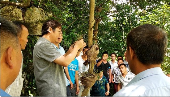 考察期间,荔波县科技产权局、农村工作局以及林业局在荔波县小七孔镇和荔波县瑶山瑶族乡联合举办了两场“铁皮石斛仿野生种植技术”培训班,参加培训的石斛种植户达100余人,培训采取专题讲座和现场讲解指导相结合的方式进行。段博士对石斛仿野生种植基地选址、种苗选择、仿野生种植方式、肥水管理和病虫害防治等方面进行详细讲解,获得良好的传播效果。