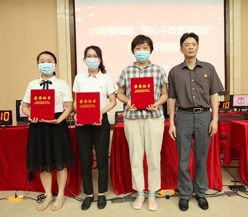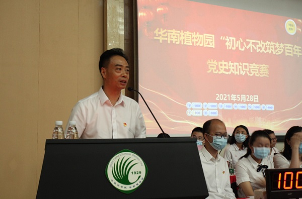 魏平在致辞时指出,在中国共产党成立100周年之际,在全党开展党史学习教育,是党中央立足党的百年历史新起点、统筹中华民族伟大复兴战略全局和世界百年未有之大变局、为动员全党全国满怀信心投身全面建设社会主义现代化国家而作出的重大决策。华南植物园举行以“初心不改 筑梦百年”为主题的党史知识竞赛,是推动党史学习教育入心入脑、走深走实的举措之一。通过竞赛促进党史学习的深入开展,引导党员干部做到学史明理、学史增信、学史崇德、学史力行,牢记“国家队”“国家人”,心系“国家事”、肩扛“国家责”,切实把学习成效转化为工作动力和发展成就,以优异成绩庆祝建党100周年,推动华南植物园各项事业的发展。