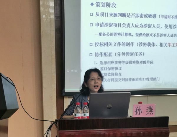 孙燕处长所作的“涉密科研项目全过程保密风险管理”培训报告,从涉密科研项目的5个阶段(策划、立项、实施、结题、归档),涉密科研项目定密、人员管理、载体管理、设备管理、工作场所、涉密会议、新闻宣传、外场试验、对外交流等全过程保密管理,以及泄密追究等几个方面进行了讲述,报告针对性强,对涉密项目全过程管理起到了很好地指导作用。