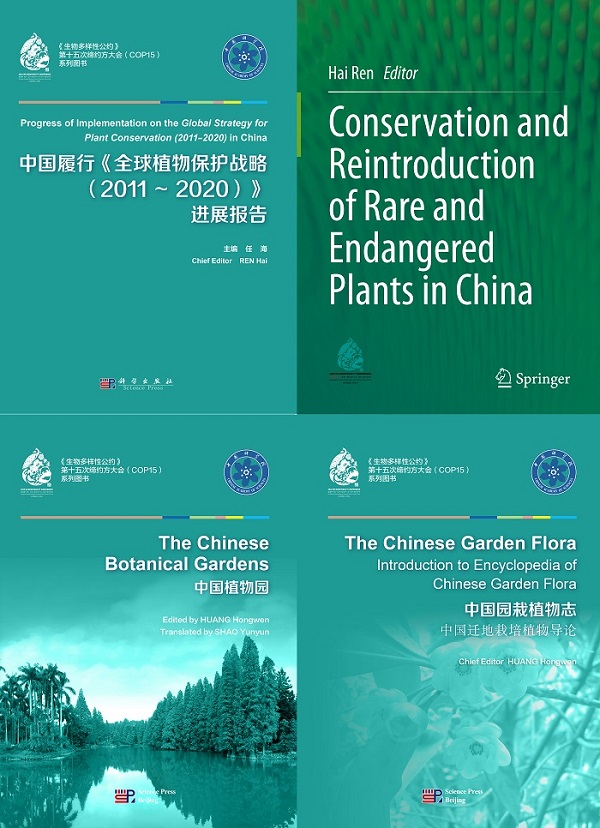 四部专著分别是:由国家林业和草原局与中国科学院共同组织,任海研究员主编的《中国履行<全球植物保护战略(2011-2020)>进展报告》(中英文版,科学出版社)、任海研究员主编的Conservation and Reintroduction of Rare and Endangered Plants in China(《中国珍稀濒危植物的保护和回归》英文版,Springer);黄宏文研究员主编的The Chinese Botanical Gardens(《中国植物园》英文版,科学出版社)和The Chinese Garden Flora— Introduction to Encyclopedia of Chinese Garden Flora(《中国园栽植物志—中国迁地栽培植物导论》英文版,科学出版社)等著作。