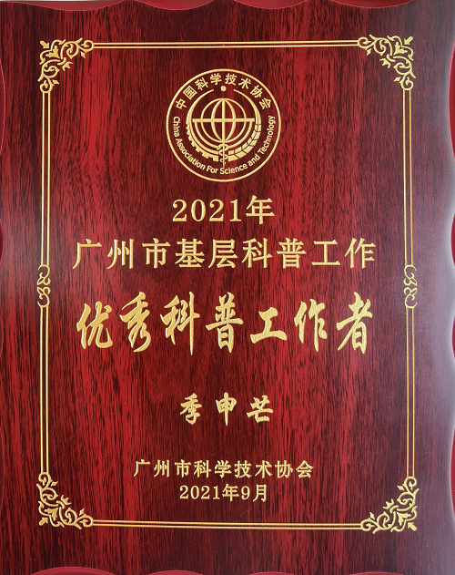 2021年,中国科学院华南植物园认真贯彻落实《中华人民共和国科学技术普及法》和《全民科学素质行动规划纲要》,紧密围绕市委、市政府的工作大局,大力传播科学知识,倡导科学方法,弘扬科学精神,建设科学文化,努力推进广州市科技进步与技术创新,特别是在疫情防控期间,主动作为,全面展示科普基地的担当和奉献精神,为广州市经济社会发展、科技进步和全市公民科学素质的提高做出了积极的贡献,获广州市科学技术协会授予“2021年广州市基层科普工作先进集体”称号。我园科普旅游部季申芒同志在基层科普工作中兢兢业业、努力推进自然与环境教育,为提高公众科学素质贡献力量,获“2021年广州市基层科普工作优秀科普工作者”称号。