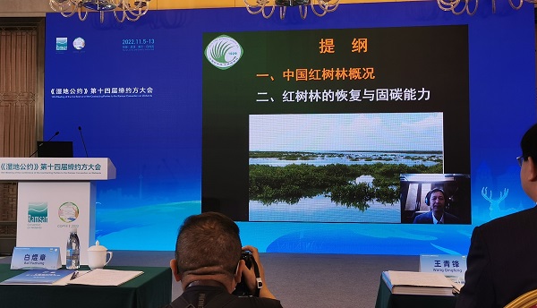 11月8日,《湿地公约》COP14大会“湿地植物多样性保护与永续发展”主题论坛在武汉东湖国际会展中心开讲,受主办方中国野生植物保护协会的邀请,华南国家植物园任海研究员以视频形式做题为“中国红树林的恢复与固碳能力”的主旨发言,他结合大会主题,报告了中国的红树林保护、恢复、固碳能力、适应性管理等问题。