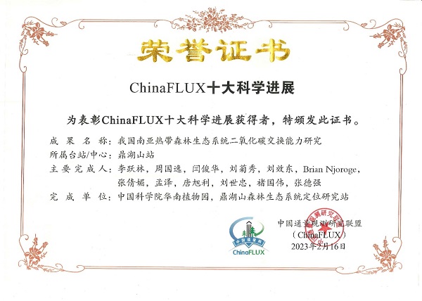 鼎湖山站荣获ChinaFlux十大科学进展荣誉证书
