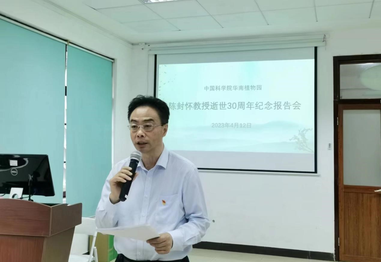 为深入学习宣传贯彻党的二十大精神,开展学习贯彻习近平新时代中国特色社会主义思想主题教育,推进“传承老科学家精神 弘扬新时代科学家精神在行动”专项工作,4月12日,华南植物园举办陈封怀教授逝世三十周年纪念报告会暨传承老科学家精神主题党日。党委书记/副主任魏平、副主任叶清、党委副书记/纪委书记徐海、陈封怀之子陈贻竹、学生代表,以及党员、职工、研究生90余人参加。徐海主持会议。
