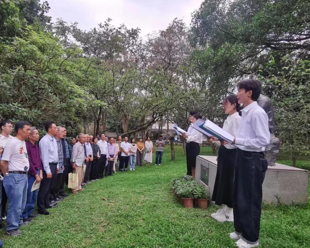 会后,与会同志聚集在陈封怀教授塑像前,4位研究生饱含激情地朗诵了由夏汉平同志创作的诗歌《你是一棵红棉——‘中国植物园之父’陈封怀教授颂》,表达了对陈封怀的敬仰之情。随后,魏平、叶清向陈封怀教授塑像献上鲜花,大家向陈封怀塑像鞠躬敬礼、默哀以表达深深的怀念。大家纷纷表示,陈封怀厚植内心的爱国情怀,敢为人先的创新精神,严谨求实、追求真理、默默奉献的高尚情操,以及集智攻关、团结协作、奖掖后学的育人精神,其所体现出来的高风亮节及高尚情操值得传承与弘扬。