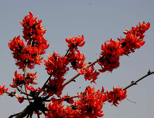 紫矿(Butea monosperma (Lam.) Kuntze),蝶形花科(Papilionaceae)紫矿属落叶乔木,高10-20m,胸径可达30cm,羽状复叶,具3小叶,革质,顶生的宽卵形或近圆形,较大,侧生的长圆形或长卵形,较小。花冠橙黄或桔红色,后变黄色,花期3-4月,果期10月。产于云南西双版纳,生于林中或路旁、灌木丛中潮湿处。印度、斯里兰卡、缅甸、越南及缅甸有分布。
