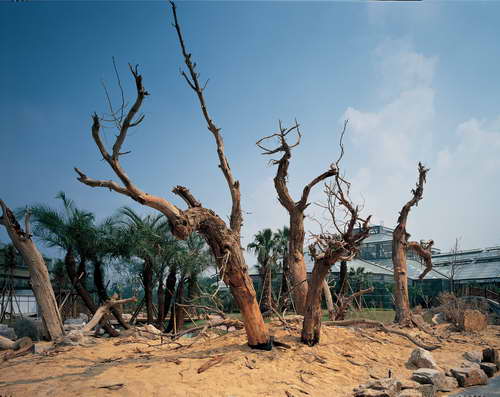 景观主题色调运用黄沙和砾石代替草坪种植,形成高低起伏的沙丘,营造出沙漠中明黄靓丽的底色,与其他几个温室的一片葱绿形成鲜明对比。景观手法上以砂石作介质,营造出悬崖峭壁、风蚀岩层、沙海孤城的景象;河岸地带运用块状黄石层叠、犬牙交错,在一河之隔的热带雨林风光对比下,异域风情凸现无疑,极富沙漠地域特色。