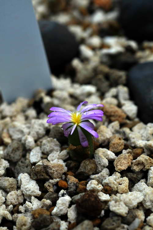 沙漠植物在生长过程中,部分种类的形体或表皮的颜色会发生一些畸形变异,主要有斑锦、缀化、石化等,由于发生的概率很低,一般情况下也是难得见到,因此变异的个体就显得尤为珍贵。在沙漠温室主入口的两侧,对称布置了两排玻璃展示柜,主要用来展示金琥缀化、金琥锦、非洲霸王柱缀化等,以及番杏科的生石花属(Lithops sp.)较为珍稀的精品沙漠植物。