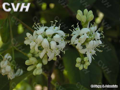 七子花的花芽正常形成一般是在7、8月份开花,花期可持续到10月初。第一眼看上去,七子花乳白色有香味的小花很像茉莉花,近看则可区分出它们是灌木丛生状的忍冬科(Caprifoliaceae)植物。处于花期的七子花通常在枝条上部的叶腋上着生2~3个头状花序,每个头状花序一般包含7朵花,其中6朵花围绕中间一朵花,因此它的中国名字叫七子花。它的属名七子花属(heptacodium)是起源于希腊语hepta(7)和kodeia(头状花序植物),也暗示它的植物学特征。