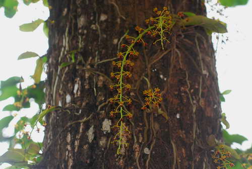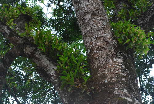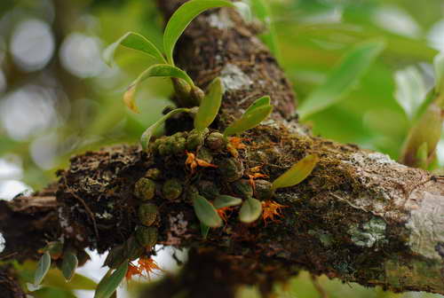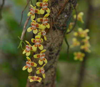 2010年6月10日至6月17日,华南植物园园艺中心的科研人员李琳博士前往云南普洱开展引种工作。三年后故地重游,仍见兰花无数,形态各异,争芳斗艳,令人欣喜不已。炎炎夏日的脚步已经逼近,各色兰花依然尽情吐露沁人的芬芳。纵使偶尔雨后的道路泥泞,也难抑寻访深谷幽兰的激情。如果说扇唇指甲兰的娇艳还不足为贵,那么异型兰那如梅瓣的清秀、似碧玉的嫩绿却不得不让人赞叹大自然的造化,这类植物没有叶片,却具有多数长而扁的根,紧紧吸附在树干上,昭示着坚强的生命力。这场兰花盛宴的主角还有串串珠玉般的节茎石仙桃(Pholidota articulata)、星芒四射状的密花石豆兰(Bulbophyllum odoratissimum)、小巧玲珑的勐海石斛(Dendrobium minutiflorum)、聚株石豆兰(Bulbophyllum sutepense)、对茎毛兰(Eria pusilla)、典雅高贵的湿唇兰(Hygrochilus parishii)、如蝇似蜂的钩梗石豆兰(Bulbophyllum nigrescens)、犹如昙花一现的白点兰(Thrixspermum centipeda)、枝杈般自由伸展的大花钗子股(Luisia magniflora )、披头散发的长叶隔距兰(Cleisostoma fuerstenbergianum)、小小吊灯状的长胡须的羽唇兰(Ornithochilus difformis)等等。