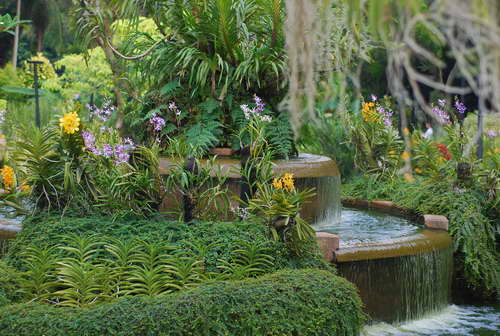 靠近新兰园是一个现代化的大型喷泉,沿着喷泉旁边一条两旁种满了文心兰的小路往上走就到了兰园主任的办公室——霍尔特姆大厅(Holttum Hall),这里曾经是兰花组培苗育种室。走进这座建筑物就像把游客从现代化的新加坡领进了一个小小的历史走廊,这个房子有空调,游客能见到宽大有花边的走廊式窗台,透过窗户可看到兰园和后院,在后院各种棕榈科植物和热带雨林树种组成了一个热带植物群落景观。新的兰园设计可展出6万株兰花。兰园内除了兰花,还种了许多其它的植物。这些植物不仅使兰园郁郁葱葱,而且还能在不同的季节,开出各种颜色和形状的花朵,给兰园提供了一种很好的美丽的背景衬托。