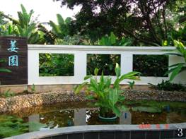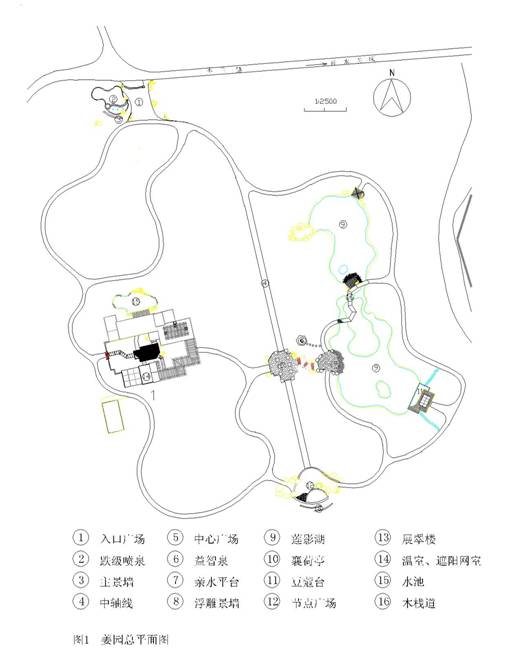 好的入口具有点题的作用,营造出主题的气氛。位于姜园近纵轴线与木兰路交界处的出入口及小广场,是游客的聚散地和休憩场所之一。入口广场的左侧设置具有3个景窗的主景墙,是姜园的重要标志。主景墙正前方是面积约100m2的喷泉,由两个大小各异的形状不规则的跌级水池组成。同时,在入口处和主景墙左侧各有一圆形的种植池,用以种植标志性的姜目(科)植物。
