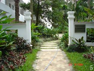 为了达到步移景异、移步换景的观赏效果,结合园路的宽窄和周围环境的变化选用了一些耐荫、常绿、宿根类的观花、观叶或观型地被植物,如大叶蚌花、小叶蚌花、七彩竹芋、紫背竹芋、美人蕉、蝎尾蕉、合果芋、吉祥草、沿阶草和银边草等;沿着园路的走向成片群植,或在路缘种植,利用地被植物不同的花色、花期、叶形和叶色等,搭配成错落有致、色彩多样的花境。
