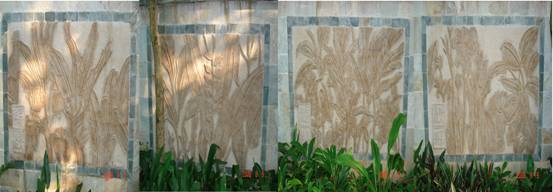 浮雕景墙是姜园标志性的园林小品,四面是用弧形的花岗岩雕刻而成的景墙,图案则是姜目八科中具代表性种类的花序。每一块浮雕上排列两个图案,并且按照姜目系统进化次序从左至右依次排列,包括了芭蕉科和旅人蕉科、兰花蕉科和蝎尾蕉科、姜科和闭鞘姜科、竹芋科和美人蕉科。