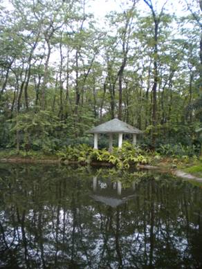 水是园林的眼睛。规划一个名为莲影湖的人工湖,旨在纪念我国著名的植物分类学家吴征镒院士发表的姜目芭蕉科植物地涌金莲(Musella lasiocarpa)。地涌金莲花如其名,黄色花朵如莲花般,直立于假茎上,似是从地里忽然涌现出来的神奇花儿。在广州每年秋季开花,花期长达8个月,具有极高的观赏价值,是高档的切花和庭院绿化植物。在湖的岸边种植地涌金莲,还可以欣赏其美丽的倒影。