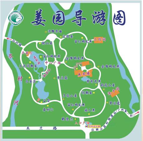 一级景点:包括姜园入口广场、展翠楼、莲影湖、中心广场和节点广场。