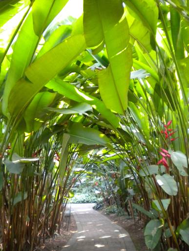 入口广场以高大的乔木为背景,利用具有浓郁的热带浪漫风情的大型木质草本旅人蕉、大鹤望兰、蝎尾蕉和芭蕉作为中层植物穿插于构筑物之中,以突出主题。