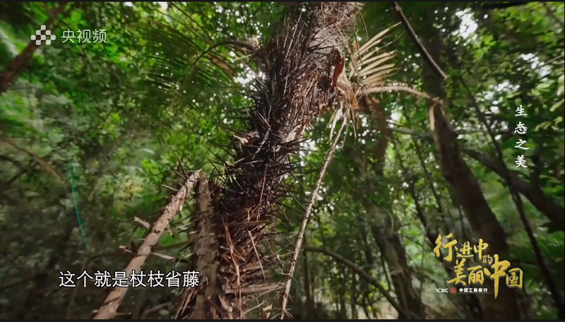 中国科学院华南植物园鼎湖山管理局副局长 范宗骥:这个就是杖枝省藤,最怕的就是它,因为漫山遍野到处都是,它这个钩刺,钩到身上很痛的。