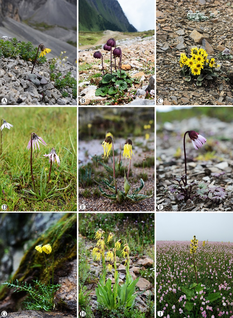 垂头菊属隶属于菊科千里光族,是中国-喜马拉雅地区的高山特有属,绝大多数种类生于海拔3000–5000米的高山草甸、高山灌丛和高山流石滩中,仅个别种类的分布海拔可低至2100米。该属大多数种类头状花序单生、下垂,体态优雅、花色艳丽,具有很高的观赏价值。以往的研究对垂头菊属文献和标本未加全面考证和检查,且野外考察不足,对该属许多宏观和微观性状的研究不够全面和深入,导致属下分类系统不合理以及物种界定不当,由此可见,该属还存在诸多分类学问题亟待解决。