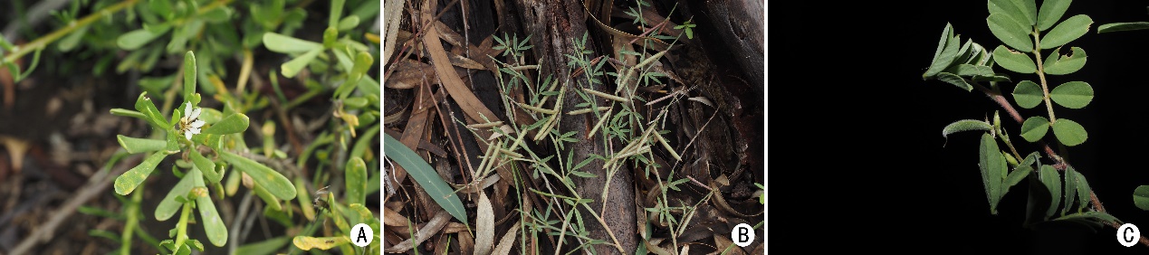 图5. A:小草海桐;B:滨海木蓝;C:西沙灰毛豆