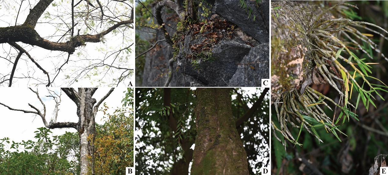 石斛属植物. A: 铁皮石斛 Dendrobium officinale, B: 细茎石斛 Dendrobium moniliforme, C: 美花石斛 Dendrobium loddigesii, D: 始兴石斛 Dendrobium shixingense, E: 重唇石斛 Dendrobium hercoglossum.