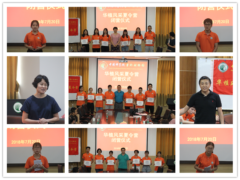 快乐的时光总是过得特别快,2018华植风采夏令营接近了尾声。20日下午,营员们穿着鲜艳的营服,参加了闭营仪式。园主任助理王瑛研究员代表园领导,对本次夏令营的圆满举办表示祝贺。并从植物研究的国家队,宽松自由的科研氛围以及优美洁净学习环境,引发大家对中国科学院、对华南植物园的再认识。侯兴亮研究员结合自身的经历,启发营员们科研要以兴趣作为指引,并提醒营员们学习工作要劳逸结合。王瑛研究员、叶清研究员、罗世孝副研究员都鼓励营员们积极报考华南植物园,投身科学的殿堂。营员们也纷纷发表感言,分享他们的收获和快乐,感谢华南植物园给予他们这次宝贵的机会以及在过程中对他们无微不至的关怀,并产生了对科学研究的热爱以及对科研工作者崇高的敬意。最后,各位出色的研究员、优秀的科学家为同学们颁发了华植风采夏令营结业证书。2018年华植风采夏令营圆满结束!