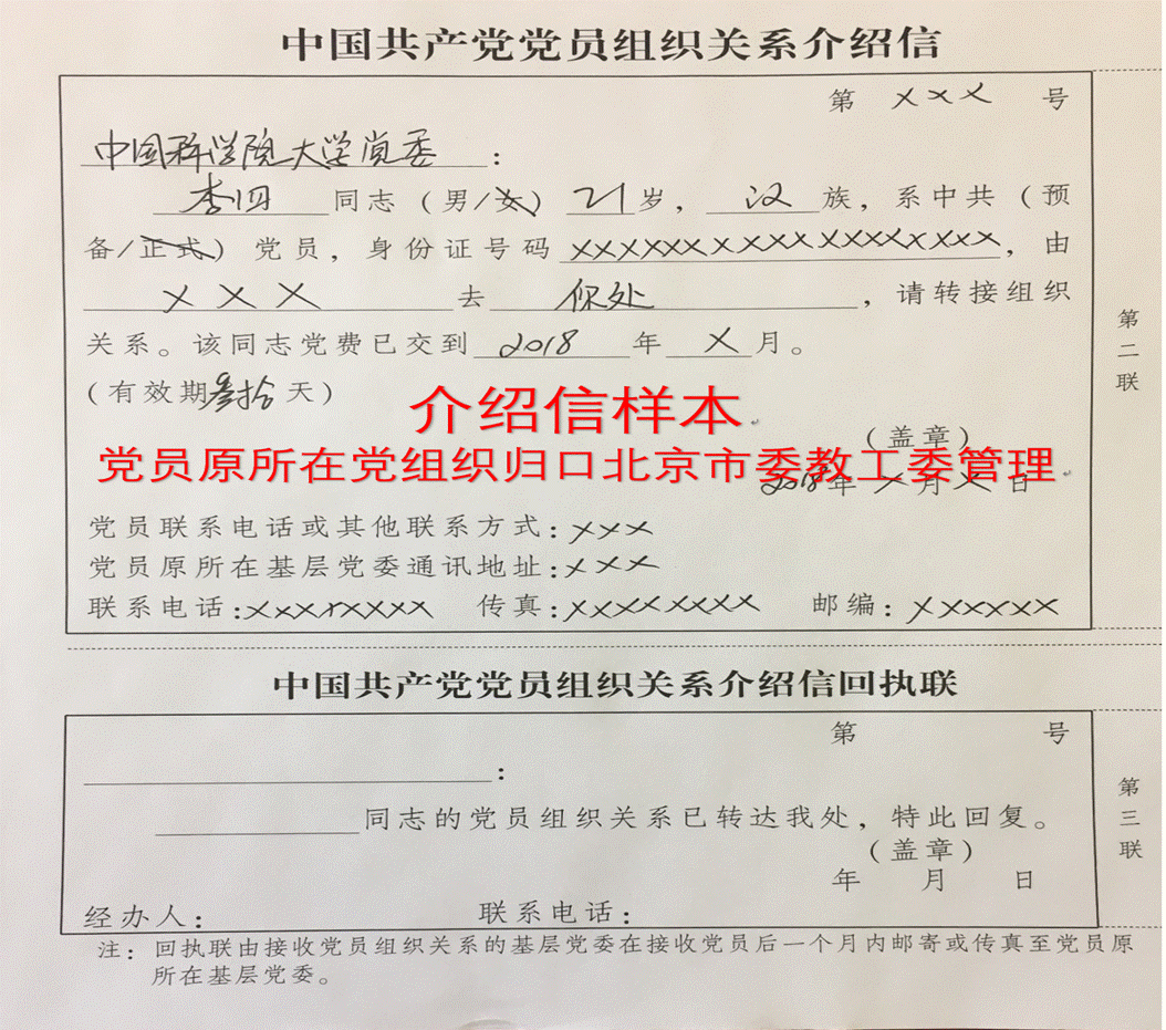 2. 党员组织关系介绍信需由县(团)级以上党委组织部开据,党员原所在党组织不归口北京市委教工委管理的抬头单位应填写:“北京市委教工委组织处”,去处应写“中国科学院大学党委”;党员原所在党组织归口北京市委教工委管理的抬头单位直接写:“中国科学院大学党委”。参加集中教学的研究生到中国科学院大学报到时,根据通知将组织关系介绍信交院系党委或学校党委组织部。