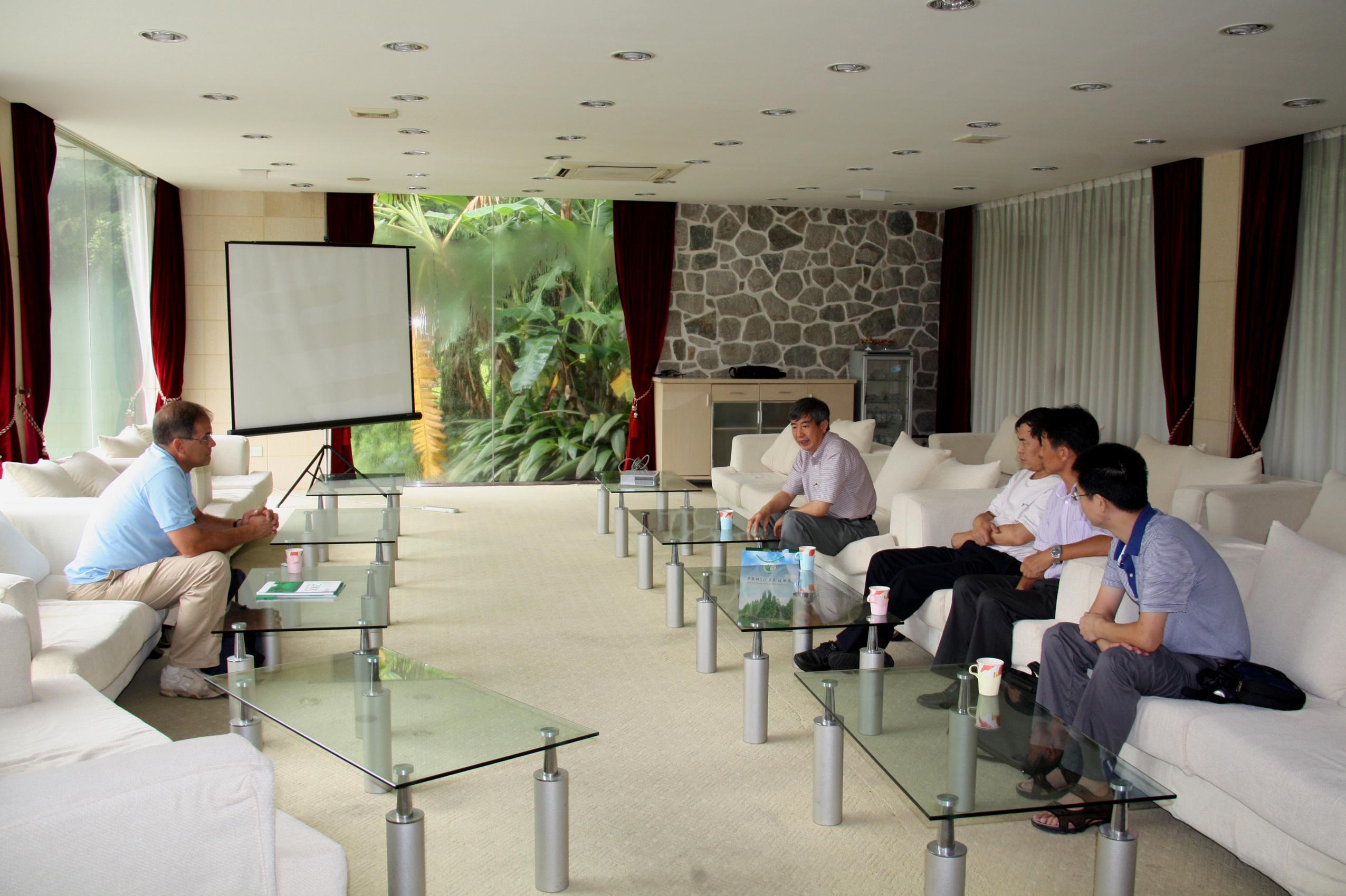 黄宏文向客人简要介绍了华南植物园的历史、研究现状和未来发展方向。Larry Nau也简要介绍了这次来访的主要目的、IWGS概况和国际荷花品种登录等情况。会谈后双方互赠书籍画册等纪念品并合影留念。随后,来宾参观了园科研大楼中心实验室、标本馆、图书馆、景观温室群和水生植物专类园等。华南植物园良好的科研条件、优美的园林景观和丰富的植物多样性等给来宾留下了深刻的印象。