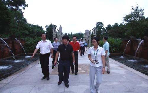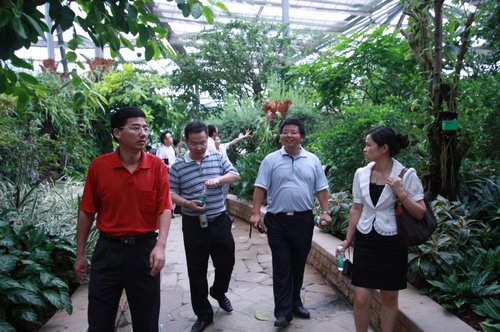 随后,代表团重点参观了大型展览温室群。他们对景观温室能艺术地再现亚洲、非洲与美洲热带雨林及亚马逊河谷雨林的神秘与奇特赞叹不已,并对温室的设计施工、景观与植物配置、开放后的管理与运作方式等进行了全面了解。蒋峻青一行对温室群的建设和构思给予了充分肯定,认为温室群具有优美的园林外貌、丰富的科学内涵和世界一流水平的园艺布局。代表团还考察了广州第一村、苏铁园、兰园和药用植物园等功能园区和景点。