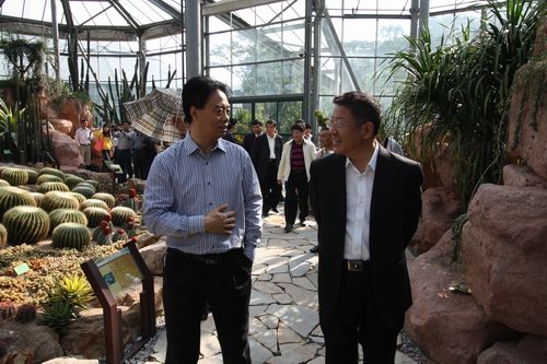 张建龙一行重点参观了世界植物奇观—温室群景区。他们兴致勃勃地参观了热带雨林室的环境模拟、雨林景观的营造和奇特雨林的植物布局,对引种自世界各地的奇异植物和高水平的保育工作表示了赞赏和肯定。客人们还参观了正在进行中了“帝王花展”,为如此美丽的帝王花在亚运会开幕之际绽放赞叹不已。参观途中,张建龙等还就植物栽培、植物保护与资源利用等问题与魏平等进行了交流与探讨。
