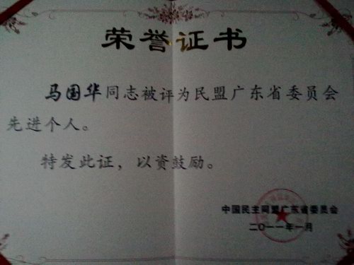 在1月11日举行的“纪念中国民主同盟成立70周年暨广东民盟组织成立69周年”大会上,马国华研究员受到中国民主同盟广东省委员会的表彰,被授予“先进个人”称号。