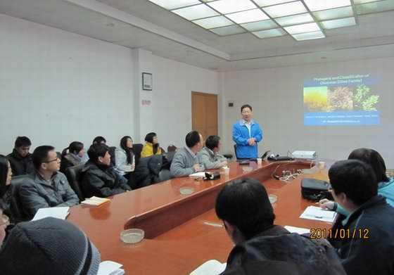 访问期间,Ki-Joong Kim教授作了题为“Phylogeny and Classification of Oleaceae (Olive Family)”的学术报告。Kim教授报告中详细介绍了木犀科的系统框架,并深入阐述了一些大属的系统关系及相关叶绿体基因组的进化事件。报告内容丰富,现场气氛活跃。随后,葛学军研究员与Kim教授就DNA条形码的发展趋势以及植物战略资源的保护与保存等方面展开了深入讨论。