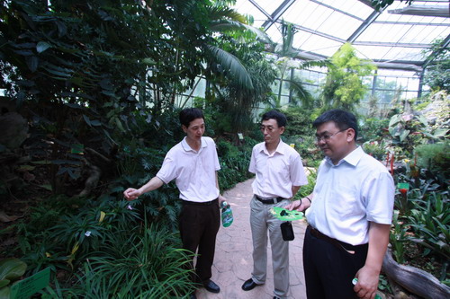 调研过程中,陈光、苏荣辉了解了华南植物园在园林园艺方面的工作情况,就“创新2020”的实施和科研队伍建设等问题进行了交流。随后,陈光、苏荣辉一行考察了苏铁园、广州第一村等景点和大型景观温室群,他们对华南植物园中西融合的园林造景、丰富多彩的植物种类和深厚的文化底蕴表示了肯定,特别对景观温室内如此多的神奇植物与优美景观赞赏不已。