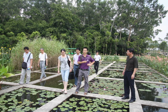 唐清华指出,近年来,广州市政府高度重视水环境建设,但效果并不理想,寻找和创建新的生态治理技术十分必要;未来几年广州市将进一步加大水环境治理力度,因此非常希望能与华南植物园开展相关的合作研究与应用。华南植物园在这方面的研究与应用一直走在前列,因此特慕名而来学习取经。陈磊就华南植物园水生植物的种植与管理、水生植物园的建设与维护、植物生态技术治理水环境的推广应用情况等向客人作了详细介绍。双方希望通过合作研究将华南植物园的相关科研成果与技术应用于地方。