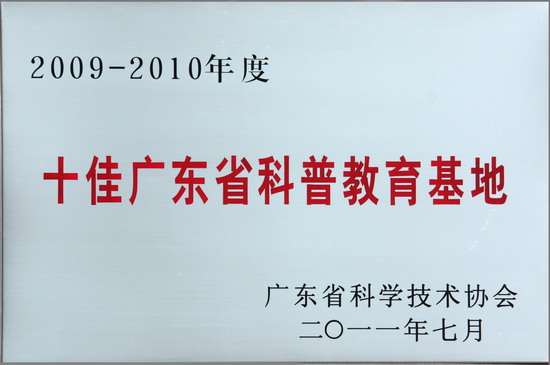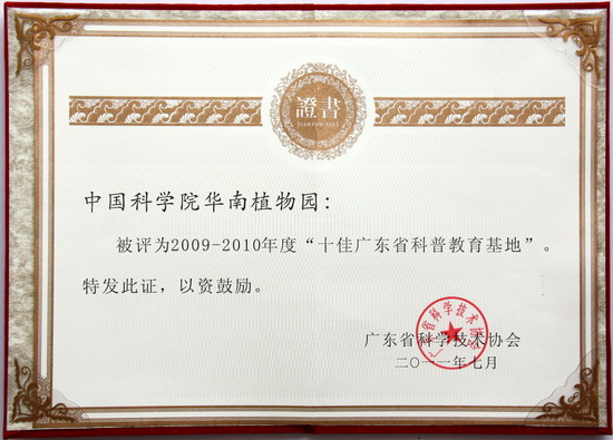 华南植物园荣获“2009-2010年十佳广东省科普教育基地”奖牌