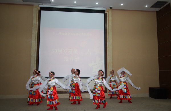 敬老祝寿会议之前还进行了精彩的文艺表演。共10个节目登台演出,均是是离退休职工自编自排的节目,包括男生小组唱、女声小组唱、男声独唱、女声独唱、排舞、舞蹈、大合唱等。全场表演活动丰富多彩、高潮迭起、掌声阵阵、欢笑不断。