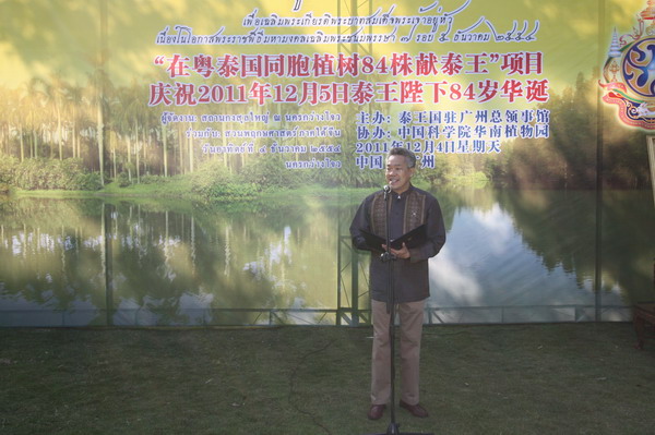 在活动的启动仪式上,泰国驻广州领事馆总领事林培森首先致开幕辞。他说,在12月5日泰国国王陛下84岁华诞来临之际,泰领馆与华南植物园共同举办“泰国在粤同胞植树84株献泰王”的活动,是为颂扬国王在大自然保护方面的卓越贡献。今年泰国发生了60年一遇的罕见水灾,让泰国民众更加意识到对森林保护、关爱环境的重要性,因此开展植树活动也是培养大家对自然和环境的热爱和责任。他衷心感谢华南植物园在此次活动中给予的极大热诚和支持,希望中泰友人共同种下的树木成长成为中泰友谊的标志和见证。