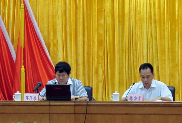 韩安贵(右)主持会议、蒋厚泉(左)作专题报告